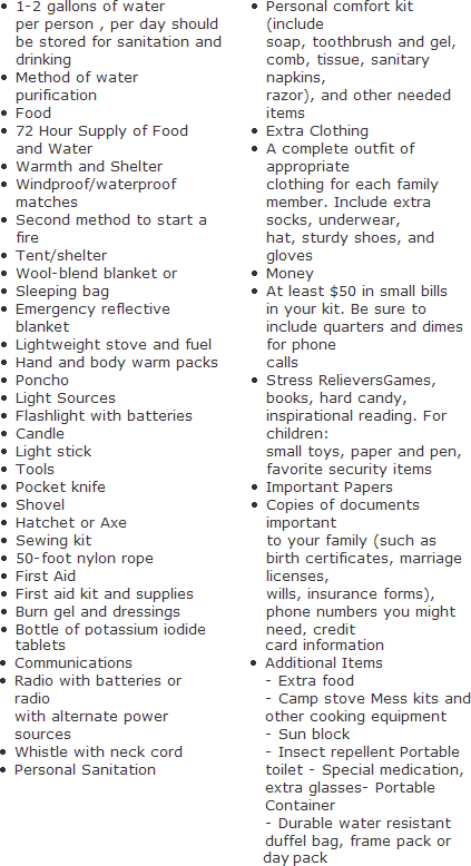 There are many types of disasters and emergencies: floods, fires, earthquakes,hurricanes and tornadoes. in many cases, a 72 hour kit could mean the difference between life and death. It is estimated that after a major disaster, it may take up to three days for relief workers to reach some areas. It would be wise to consider a 72 hour kit that you could live on for 7-10 days. In such a case, If you live in a disaster prone area a 72-hour kit is the minimum you should have available. Plan your 72 hour kit according to your familys’ size.